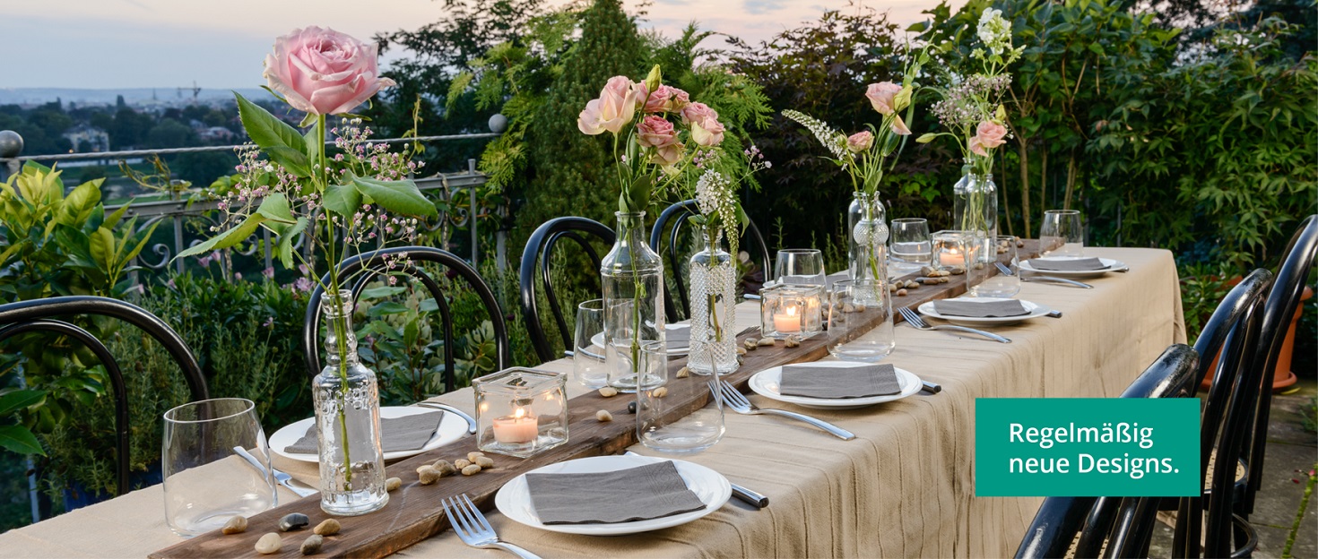 Wir sind Inspiration, Beratung, Verleih und Produktion rund um den gedeckten Tisch. Hier kannst Du nach Lust und Laune Deine Tischdekoration online gestalten und Artikel für Deine nächste Feier leihen.