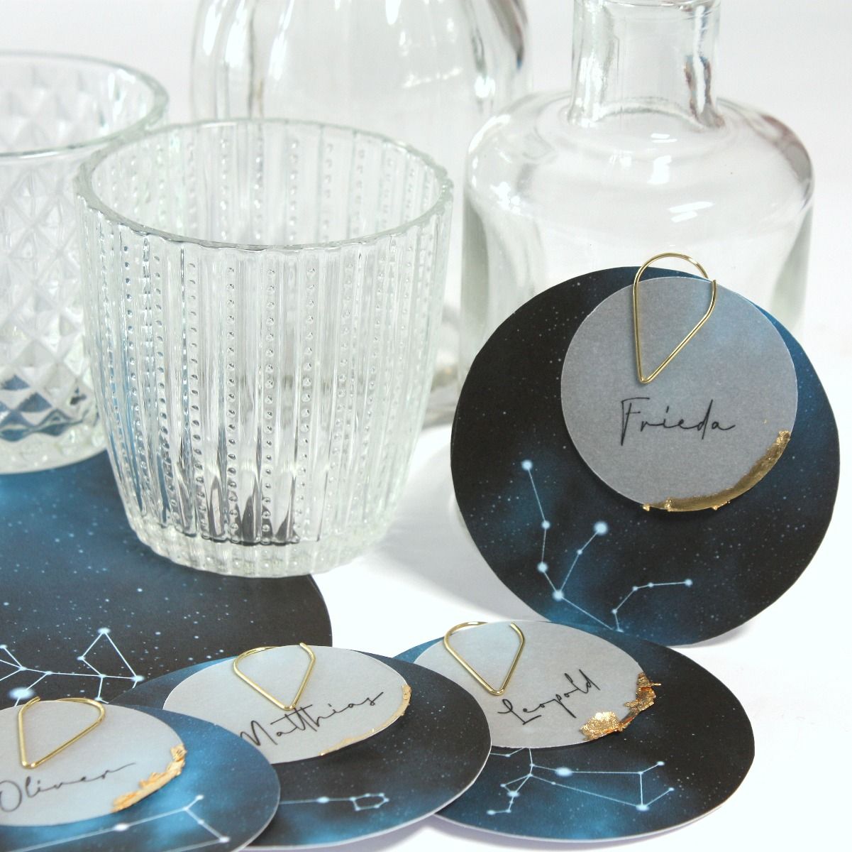 das Accessoire-Set besteht aus: 2x Vase Kristall, 2x Flaschenvase, 2x Windlicht mit Goldrand, 2x 8h-Teelicht, 8x Untersetzer Sternbild D20 cm, 8x Namenskarte, 1x Stift Nachtblau