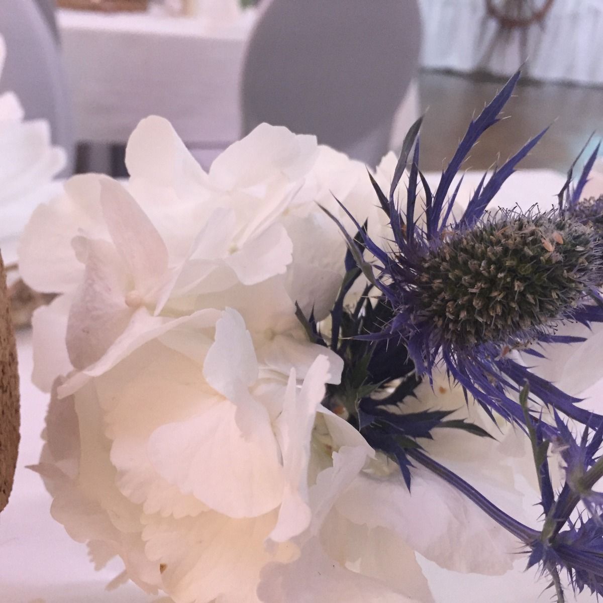 Das Arrangement beinhaltet: 2x Hortensie Patrol-Blau und Weiß, 6x Orion Disteln Blau, 2x Sukkulente im Topf, 2x Wachsflower Weiß sowie Gräser und Beiwerk