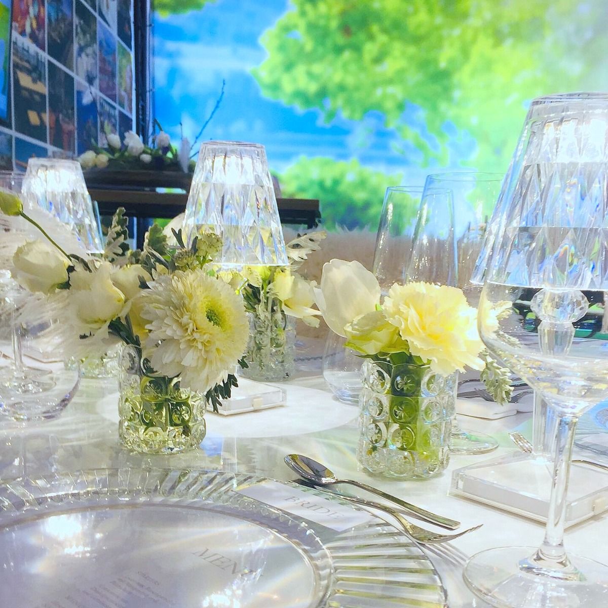 Dieses Arrangement ist auf unsere Designwelt Kristallzauber abgestimmt. Monochrome, helle Blumen dominieren, gepaart mit Federn und Beiwerk.