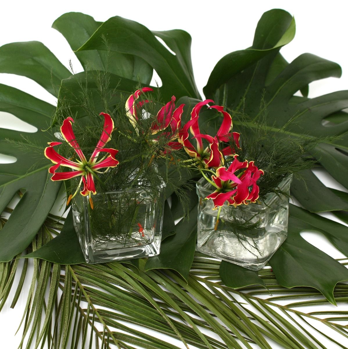 das Arrangement ist abgestimmt auf unsere Designwelt Südseezauber. Exotische Blütenpracht trifft 4x Monstera-Blatt, 4x Palmenblatt, 4x