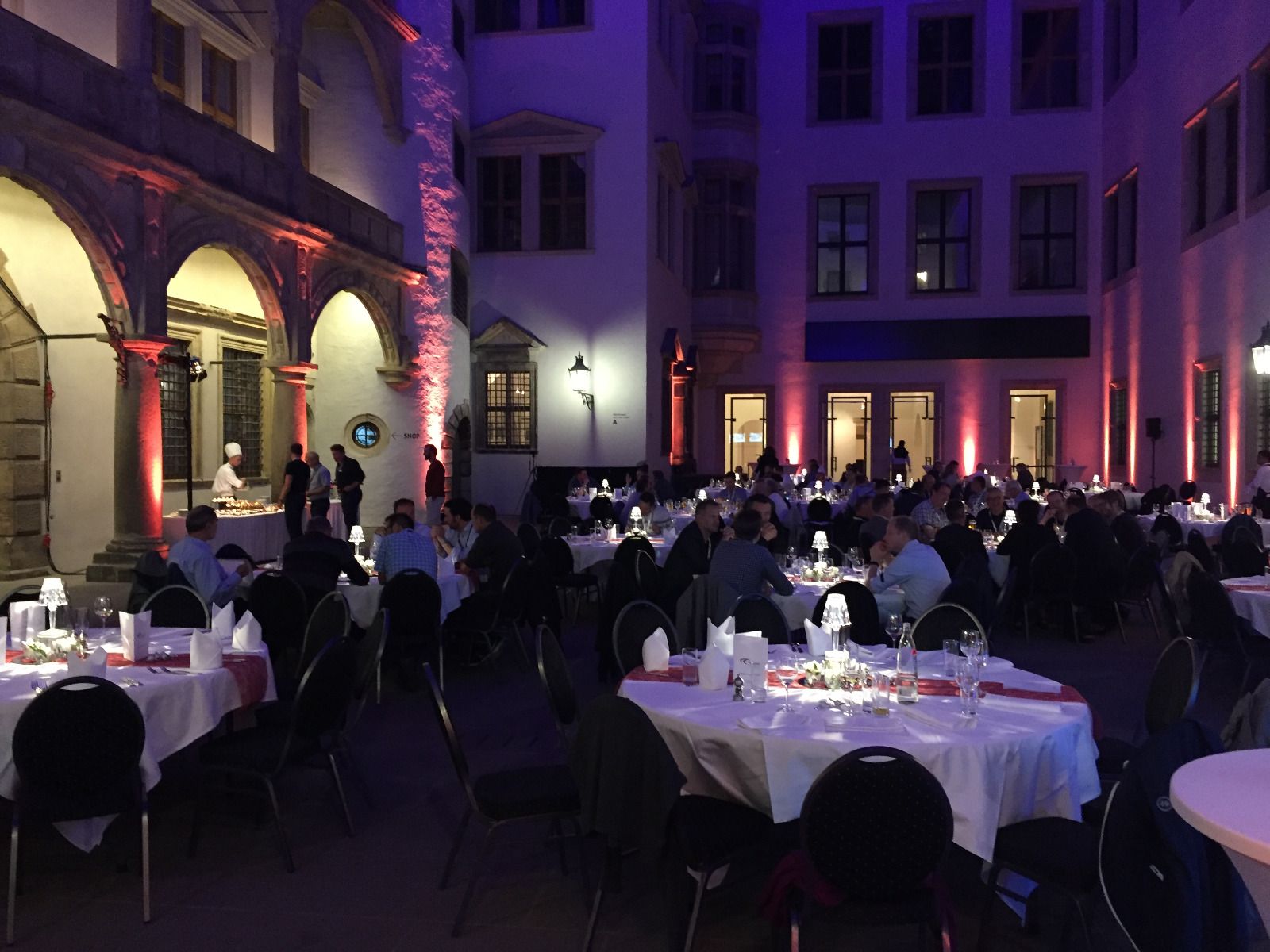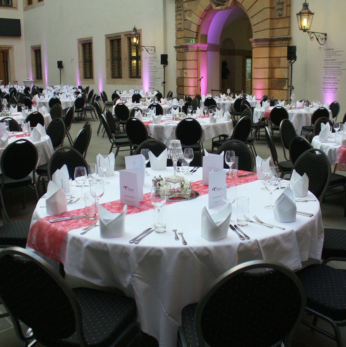 Stuhlverbinder und passende Hussen in Weiß sind verfügbar.