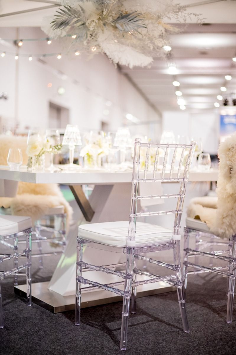 Modern und stylisch in transparentem Look. Er eignet sich perfekt für Hochzeiten oder Galadinner. Die Lieferung erfolg inkl. passender Sitzkissen in Weiß.