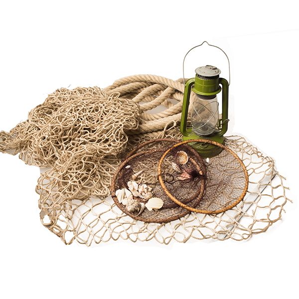 Das Set besteht aus: 1x 10m Tau, 1x Fischernetz, 1x Petroliumlampe, 3x Reuse, Beutel Muscheln.
