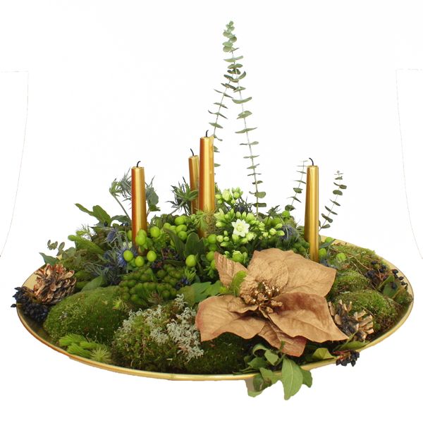Strahlende Festtage erwarten Dich mit diesem Gesteck. Es ist abgestimmt auf unsere Schale Gold D48 cm.