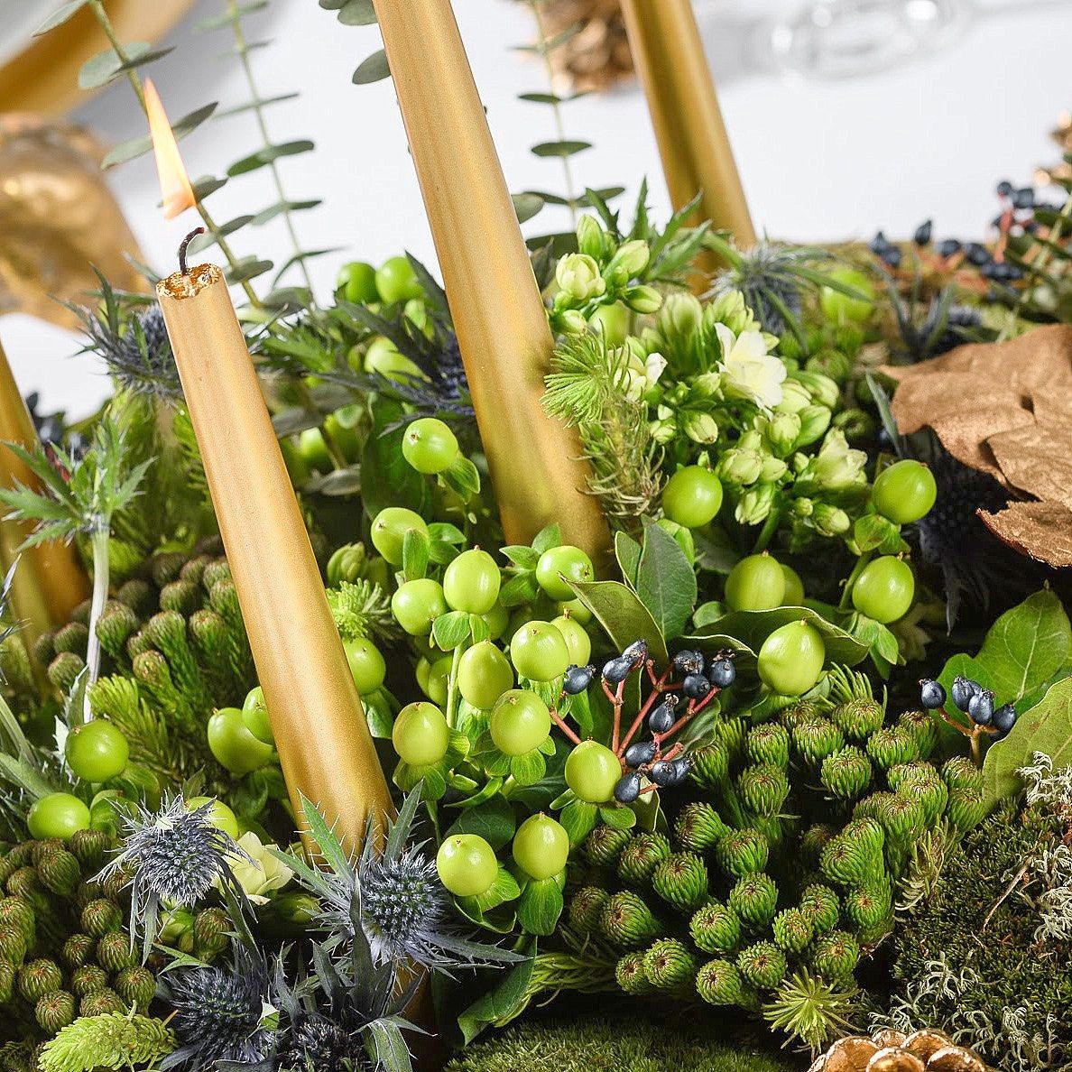Es beinhaltet: 4x Eucalyptus Cinerea, 4x Eucalyptus Baby Blue, Moos, 4x Beere der Saison, Weihnachtsstern Gold, goldene Zapfen, 4x Spitzkerzen Gold