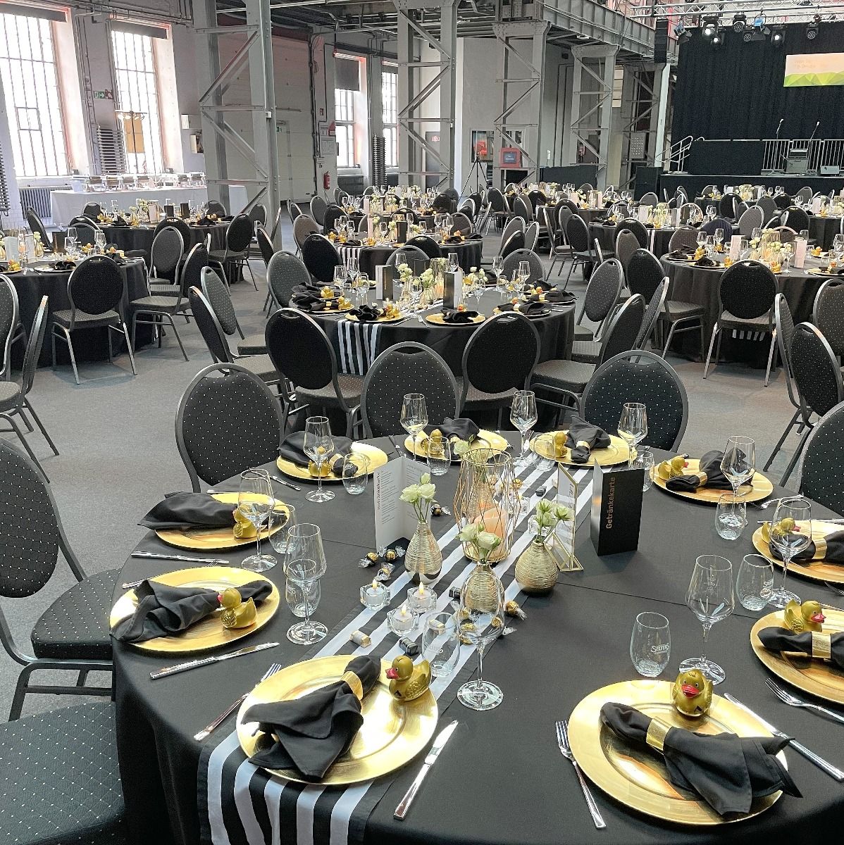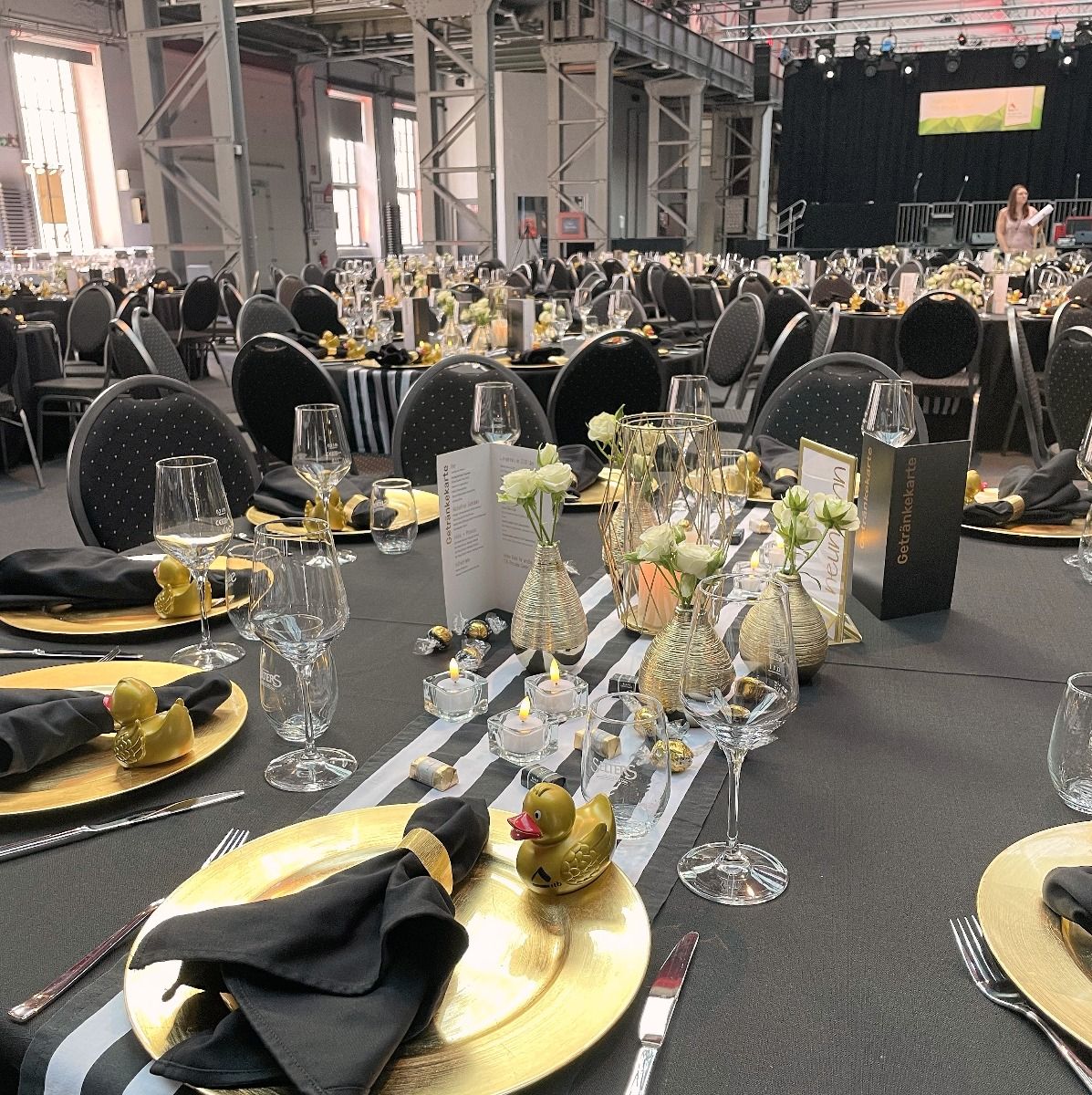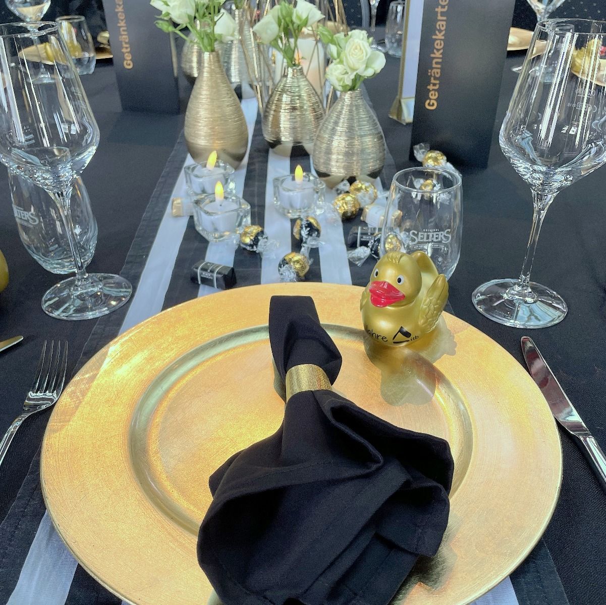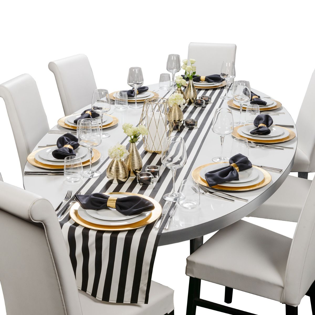 Streifen sind Hipp - sagen die Modemacher. Wir finden das auch und packen kräftig Gold dazu, damit Du glänzen kannst. Eyecatcher ist unser Tischläufer, den wir mit goldenen Vasen und Windlichtern garnieren. Perfekt für Gala, Hochzeit, Geburtstagsfeier oder Candlelight-Dinner.