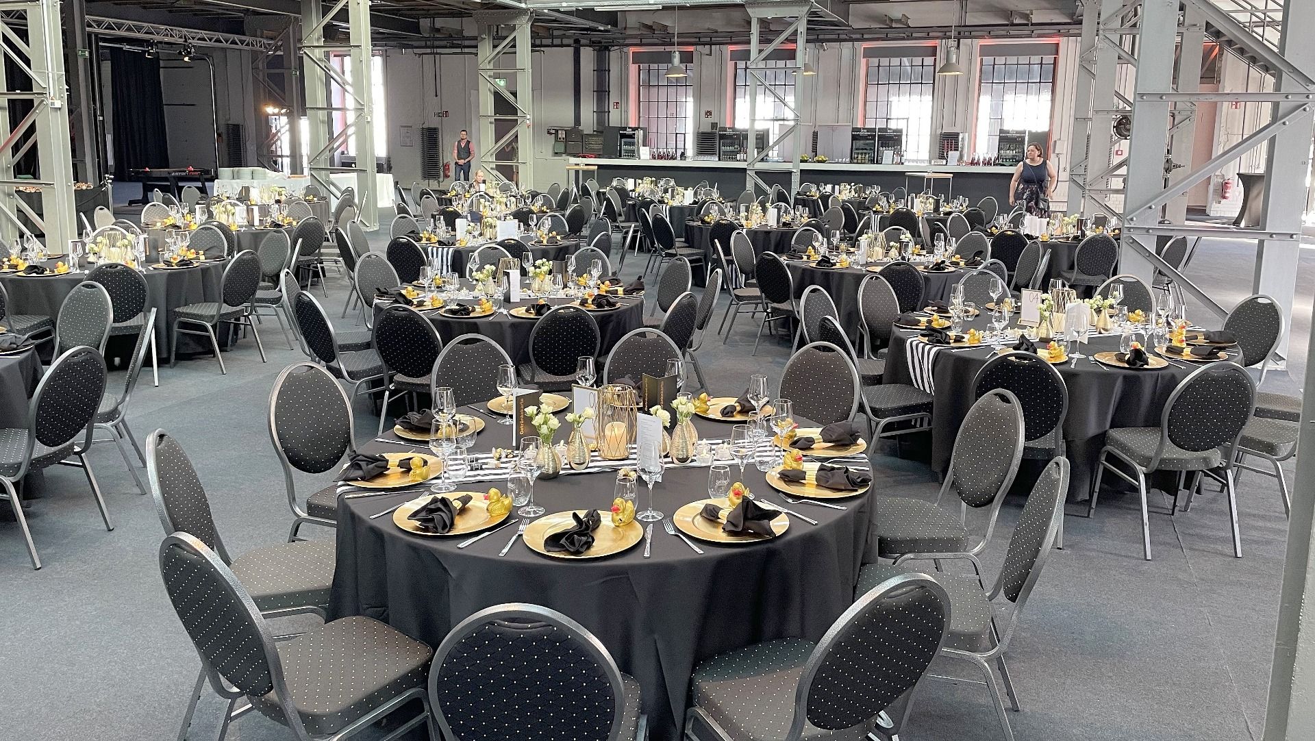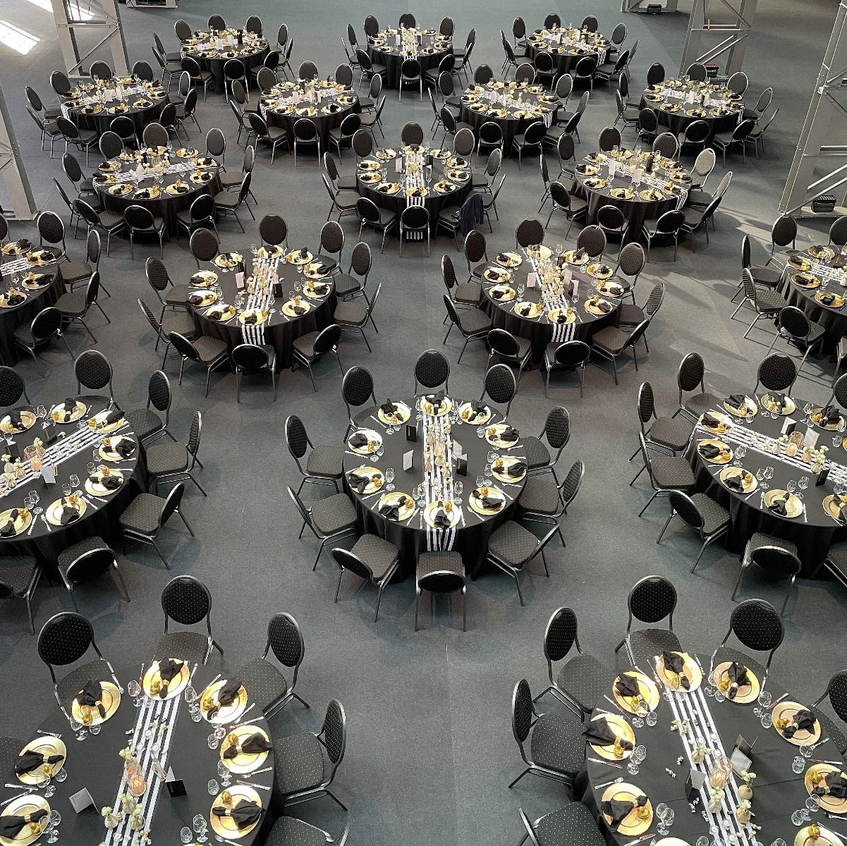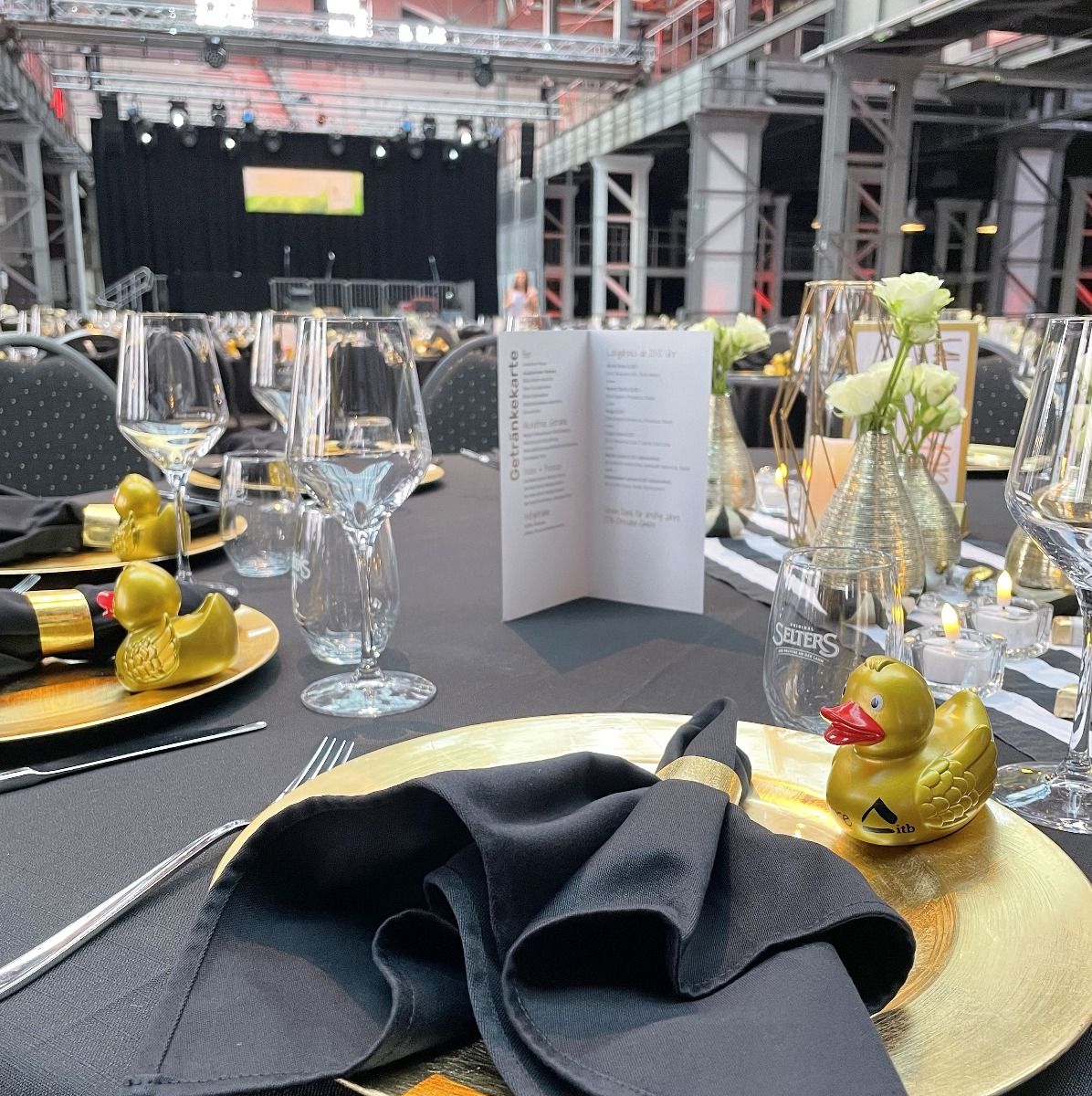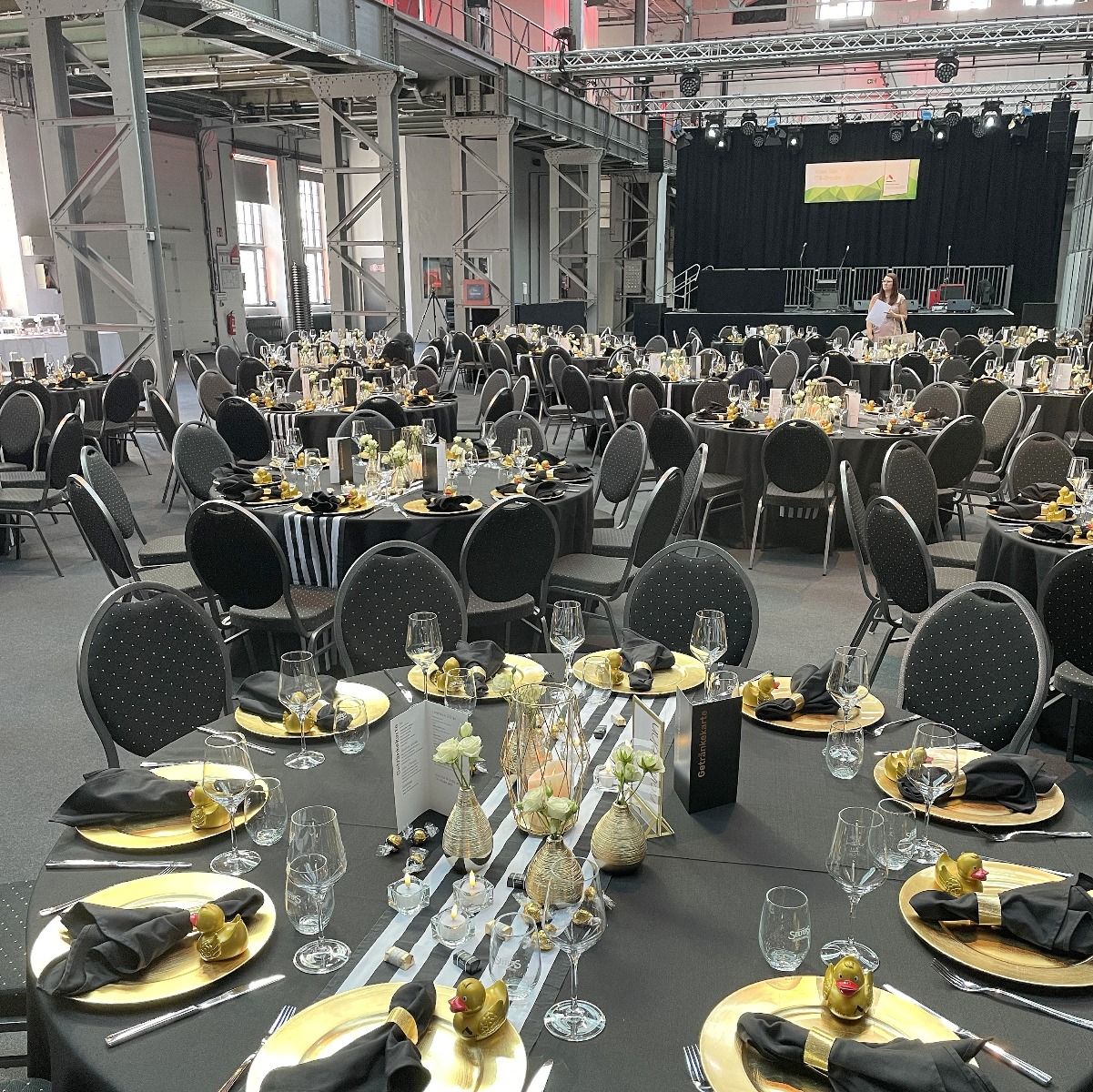 Streifen sind Hipp - sagen die Modemacher. Wir finden das auch und packen kräftig Gold dazu, damit Du glänzen kannst. Eyecatcher ist unser Tischläufer, den wir mit goldenen Vasen und Windlichtern garnieren. Perfekt für Gala, Hochzeit, Geburtstagsfeier oder Candlelight-Dinner.