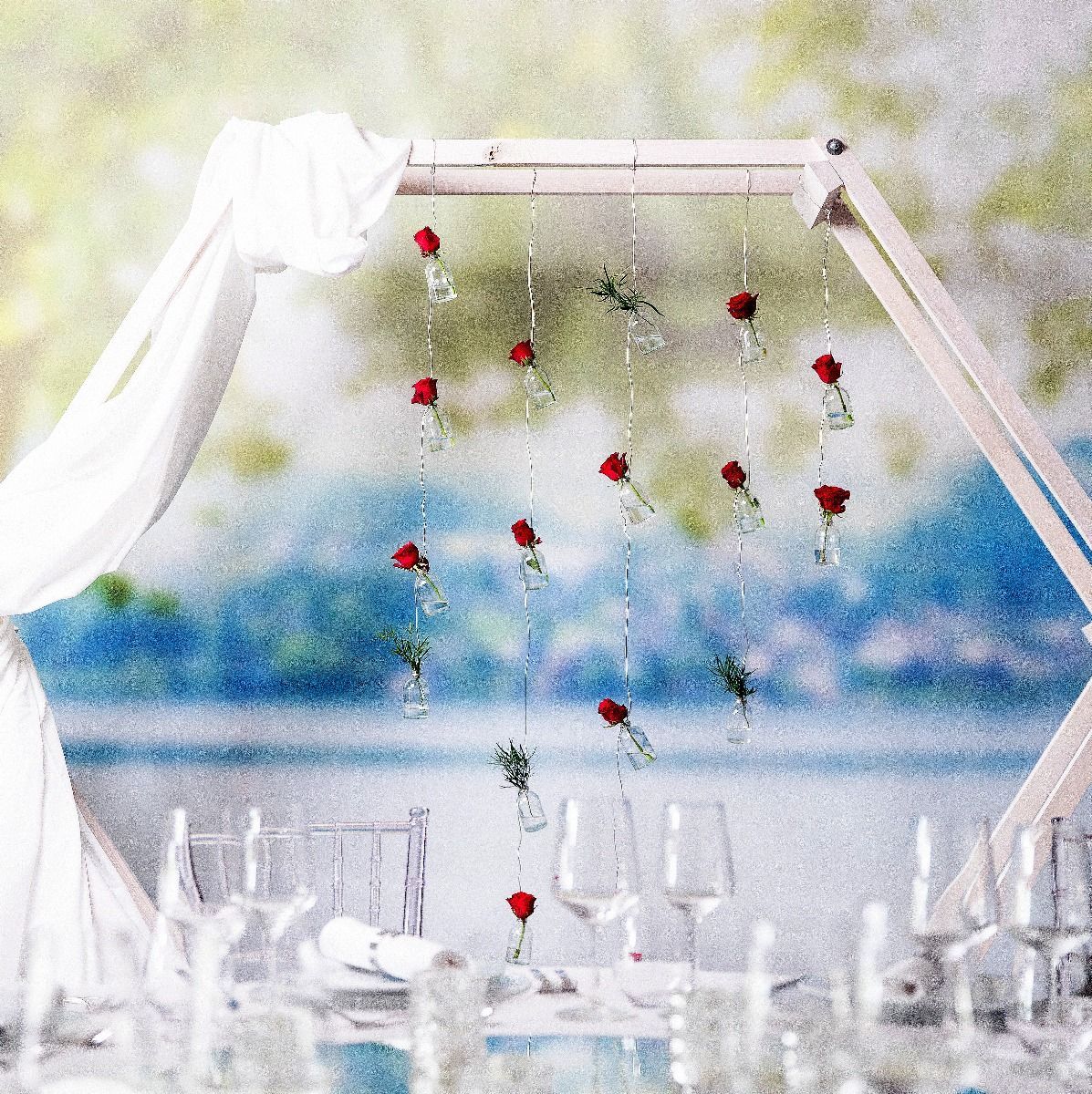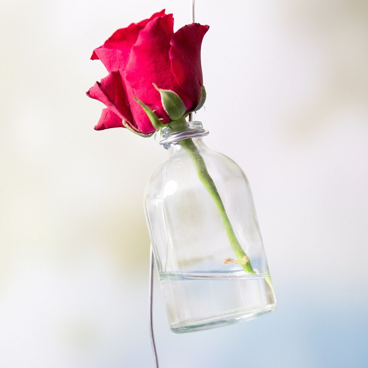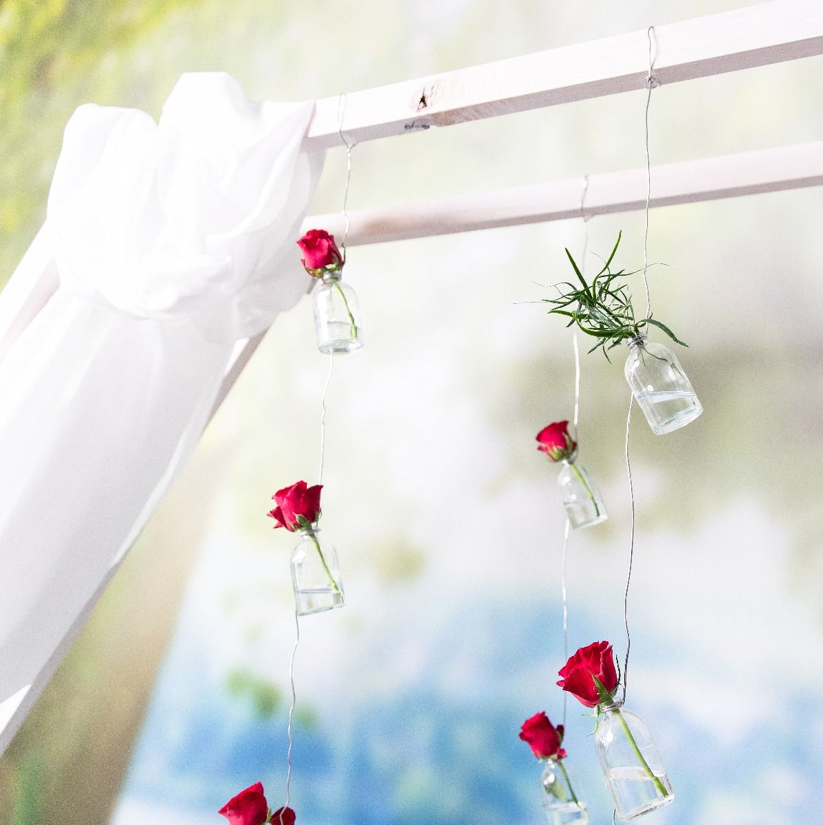 Eine kleine und vielseitig nutzbare Flasche mit kleiner Öffnung. Sie ist ideal für Tischschmuck oder florale Hängeinstallationen, wie z.B. am Traubogen oder an Stühlen.