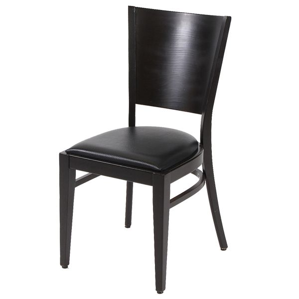 Ein bequemer und hochwertiger Holzstuhl mit einem Sitzpolster aus schwarzem Kunstleder. Klassisch, zeitlos, vielseitig und stapelbar.