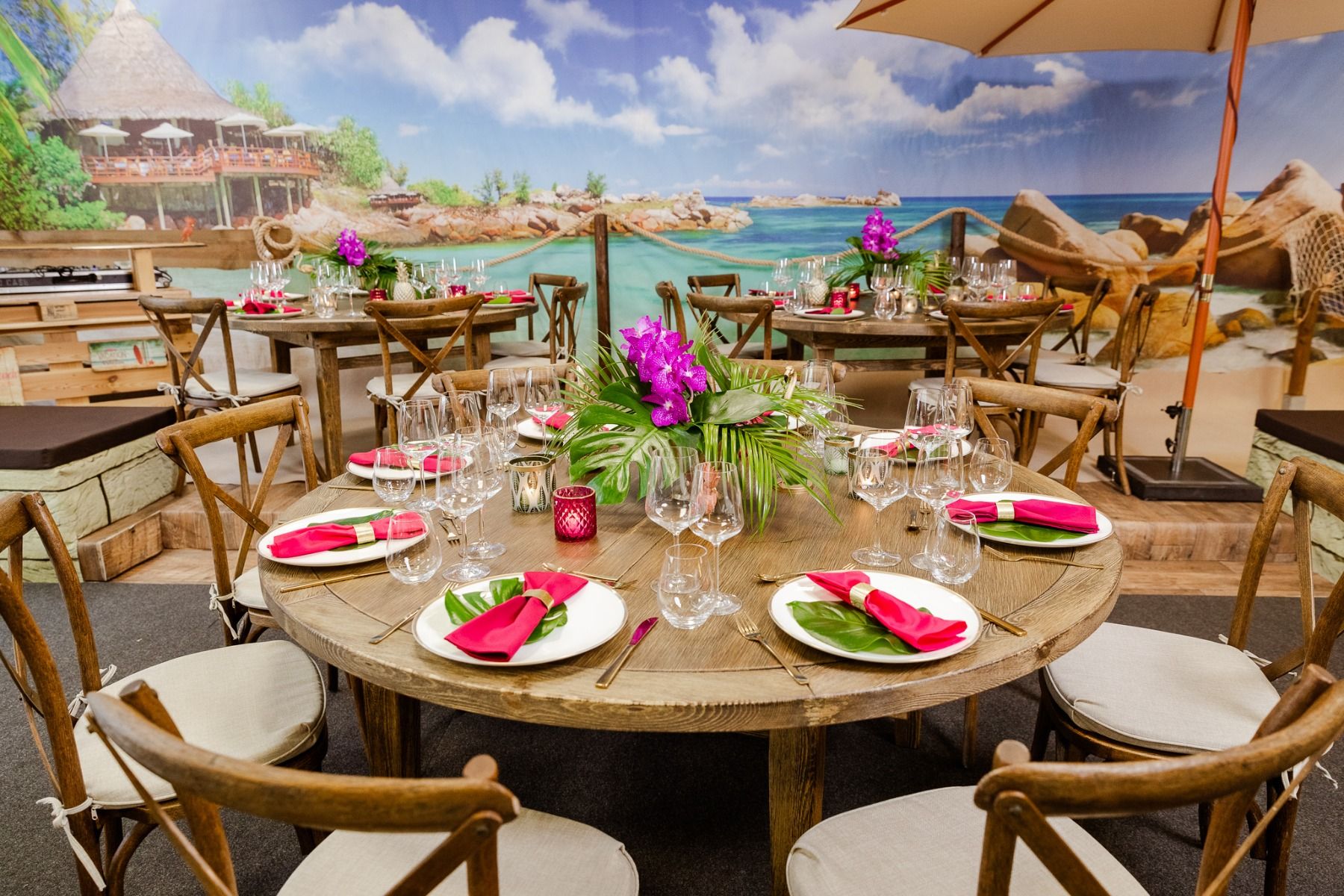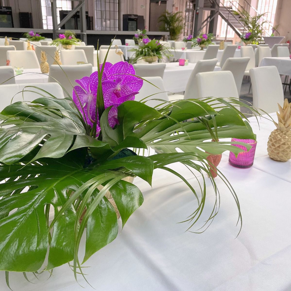 Mal wieder den Lastminute-Flug verpasst? Kein Problem. Mit diesem Design holst Du Dir den Urlaub in die eigenen 4 Wände. Exotische Orchideen und Blätter, Flamingo, Kakadu und goldene Ananas - alle sind sei dabei, um Dir und Deinen Gästen ein unvergessliches Party-Feeling zu schenken. Den knalligen Kontrast setzen Servietten in Pink und Beere. Are you ready for your last minute party?