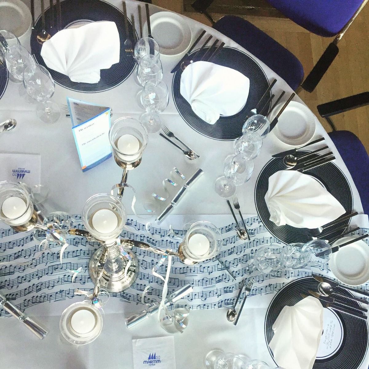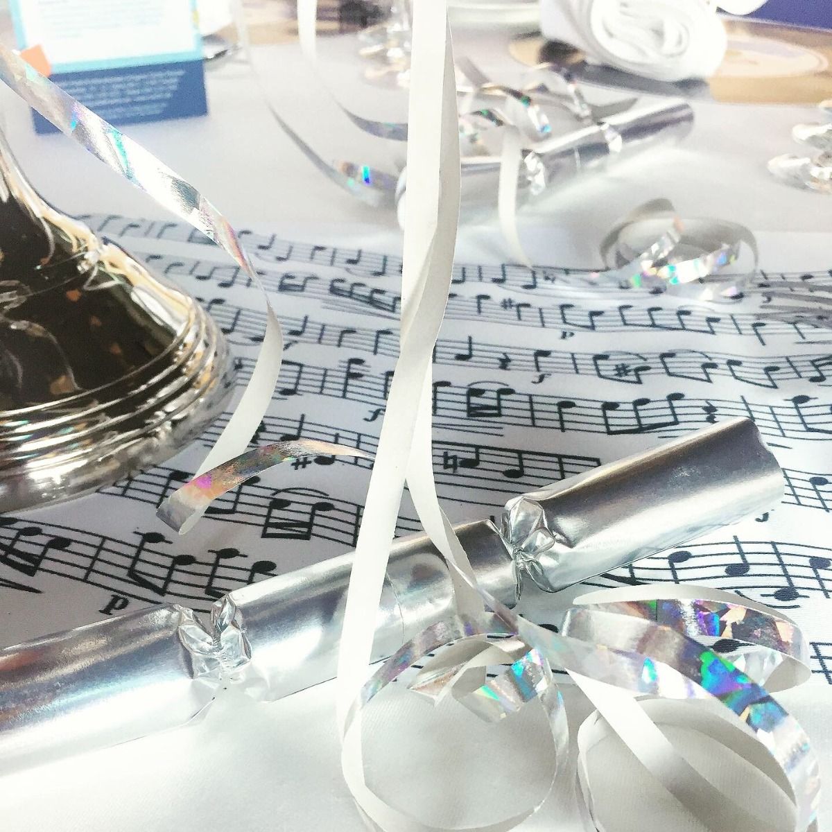 Unser Tischläufer Notenspiel verleiht jedem Tisch ein rhytmisches Design. Es passt zu Bankettischen, Hochtischen, Stehtischen und eignet sich für Partys, Dinner oder Silvesterfeiern.