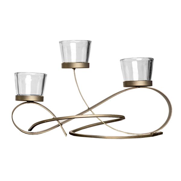 dynamisch gebogene Metallbänder tragen 3 Windlichter, ideal als Centerpiece auf schmalen, langen Tischen