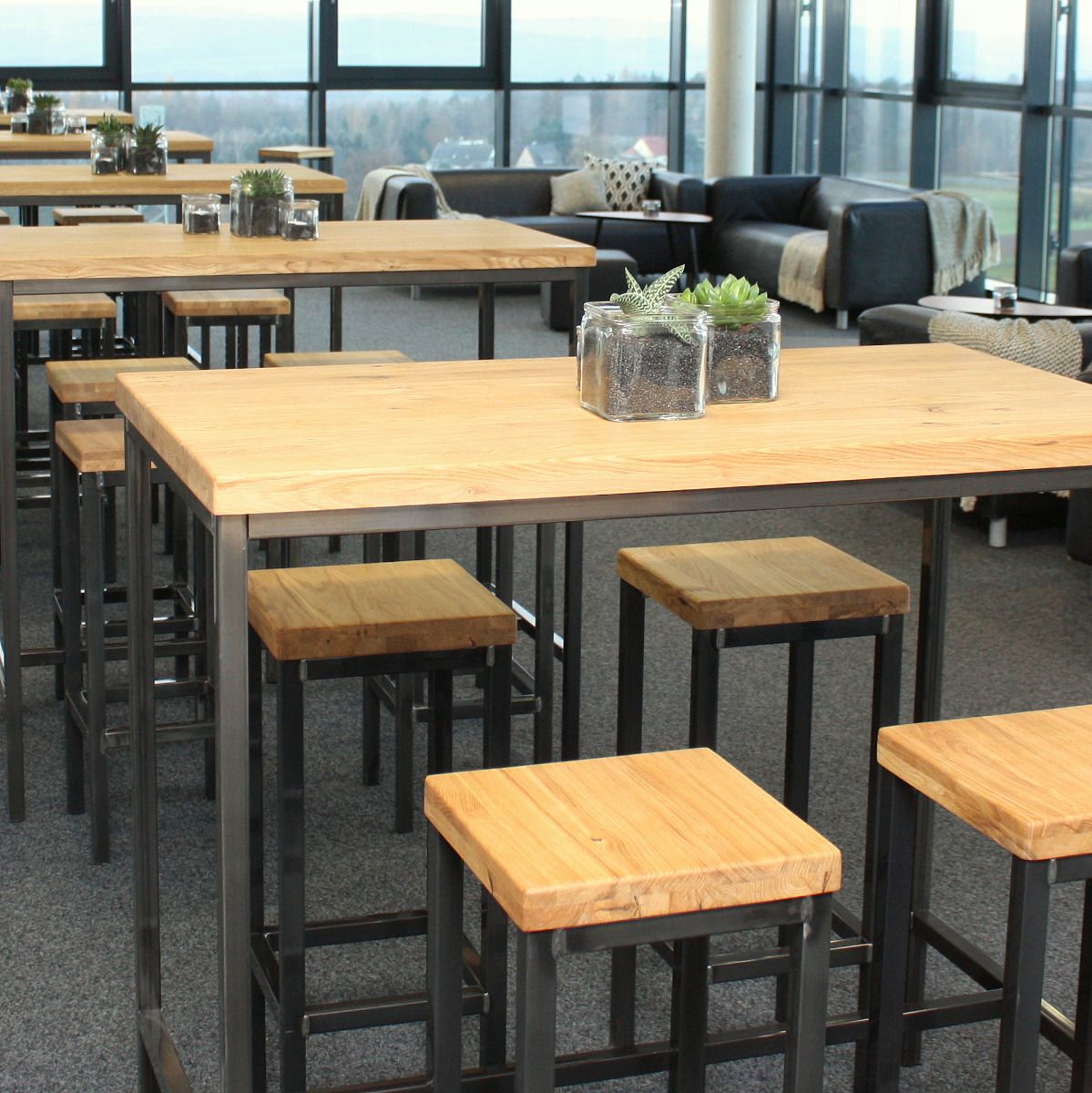 New York macht es vor, die Welt es nach; massive Eicheplatte auf schwarzem Stahlgestell - fertig ist der NY-Loftstyle. Perfekt für alle Arten von Empfängen, für Meetings und Aftershow-Party. Kombiniert mit einem puristischen Centerpiece liegst Du hier voll im Trend.