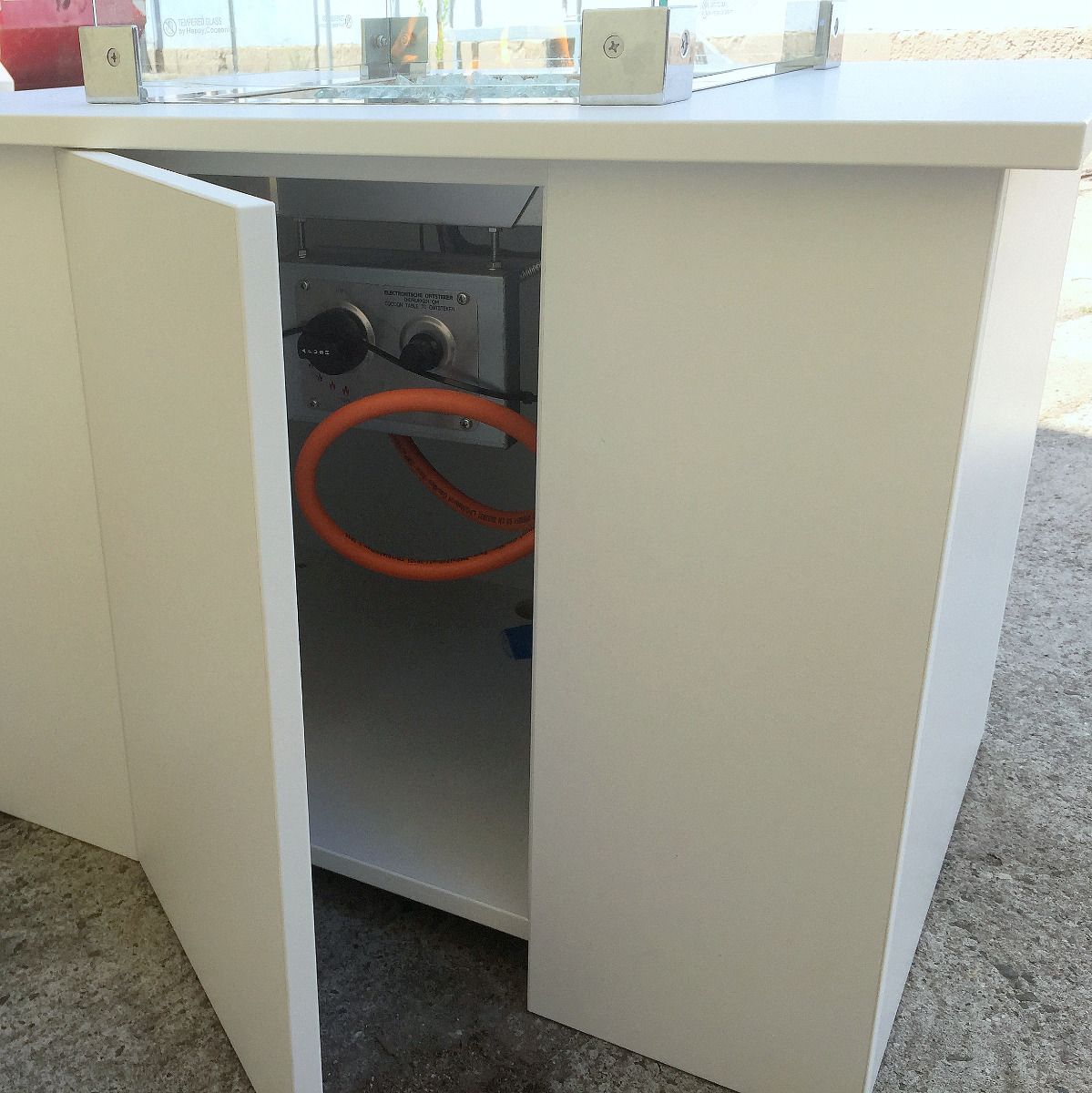 Der Loungetisch verfügt über eine zertifizierte, schwebend montierte Feuerstelle mit Propanbrenner analog einem Heizstrahler.
