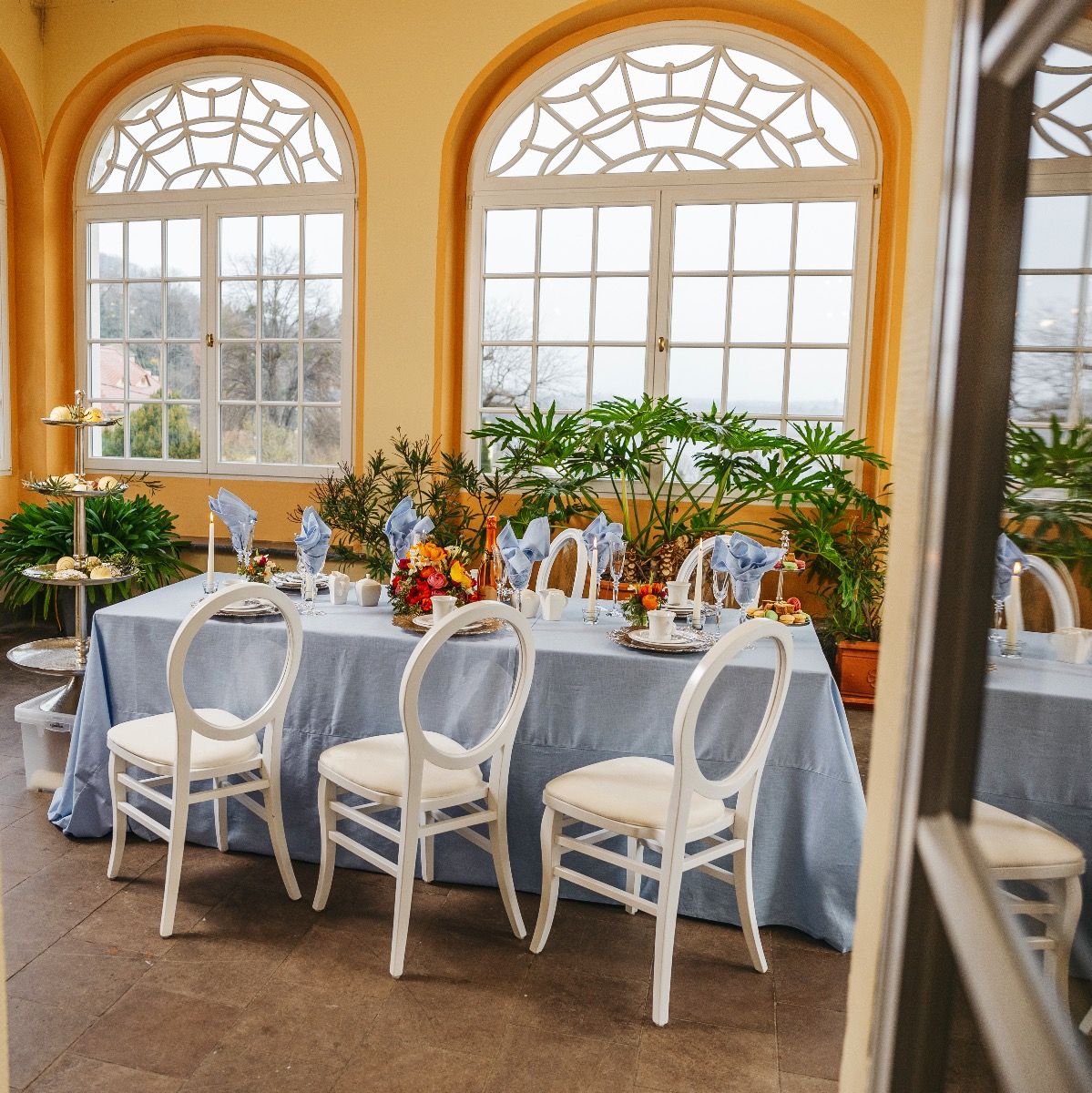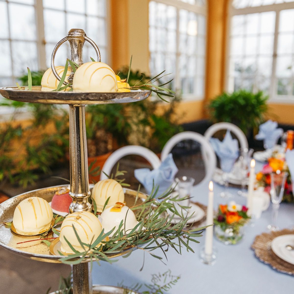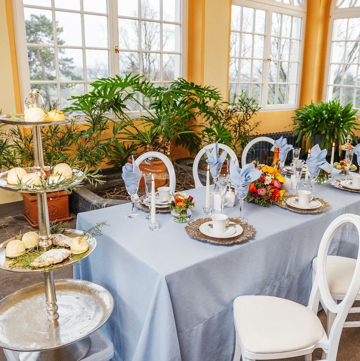 Etageren (H120 cm), Makarons, Sekt und Kaffeegeschirr sind nicht Teil des Sets.