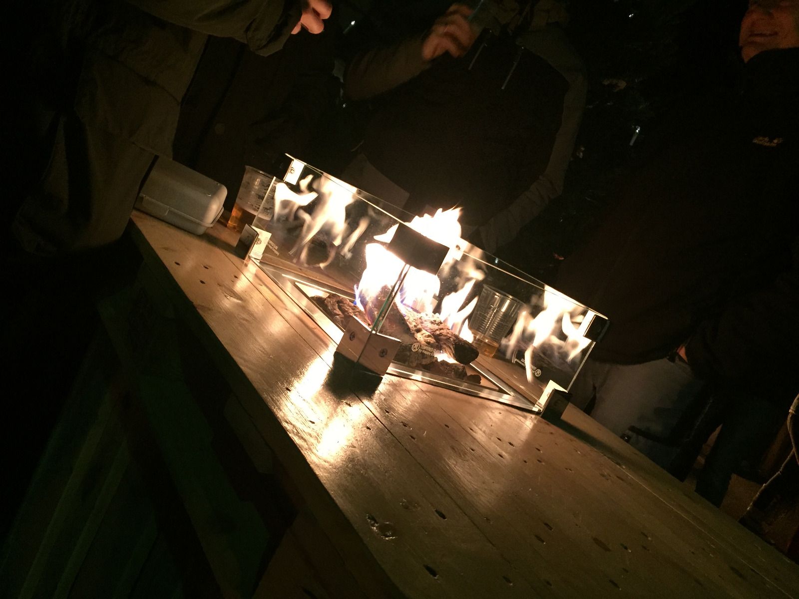 Der Feuerstelle ist eine zertifizierte, schwebend montierte Feuerstelle mit Propanbrenner und Lavasteinen - analog einem Heizstrahler. Eine 11Kg Propangas-Flasche ist inklusive.