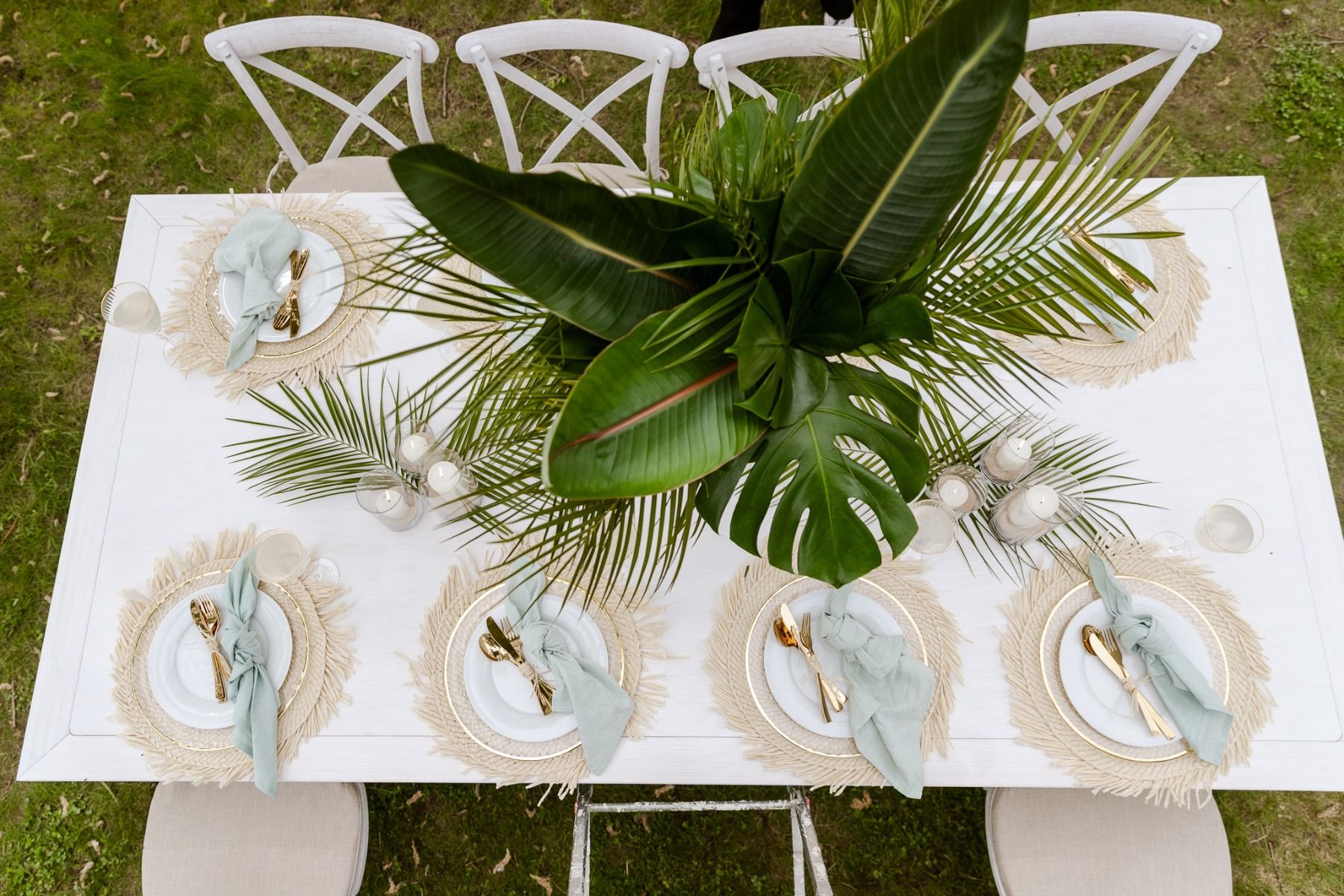Was bei einem stürmischen Shooting in Sachsen entstand, gehört eigentlich ins sonnige Florida. Mit PalmBeach holt Ihr Euch Urlaubsfeeling pur auf die Tafel. Große Blätter und Wedel, Sand und ein Hauch von Luxus machen dieses Design zum idealen Look für Hochzeit oder Sommerfest. Dazu ein Mojito oder CubaLibre ... dann stellt sich das Rauschen der Wellen und Palmwedel von ganz allein ein ... Versprochen!