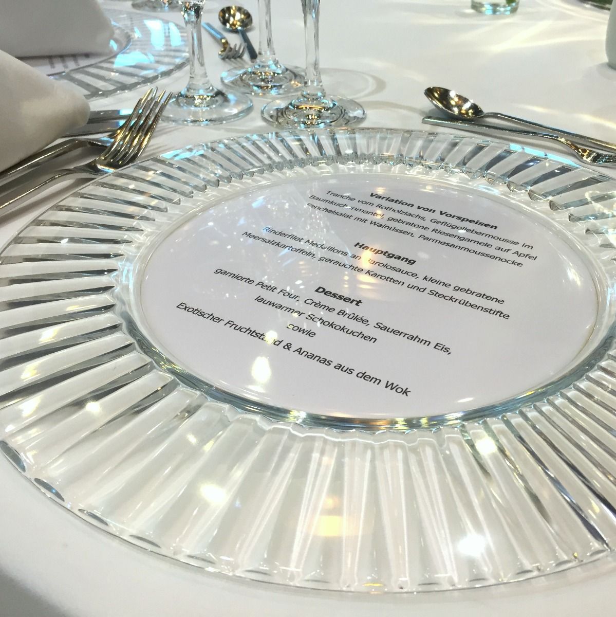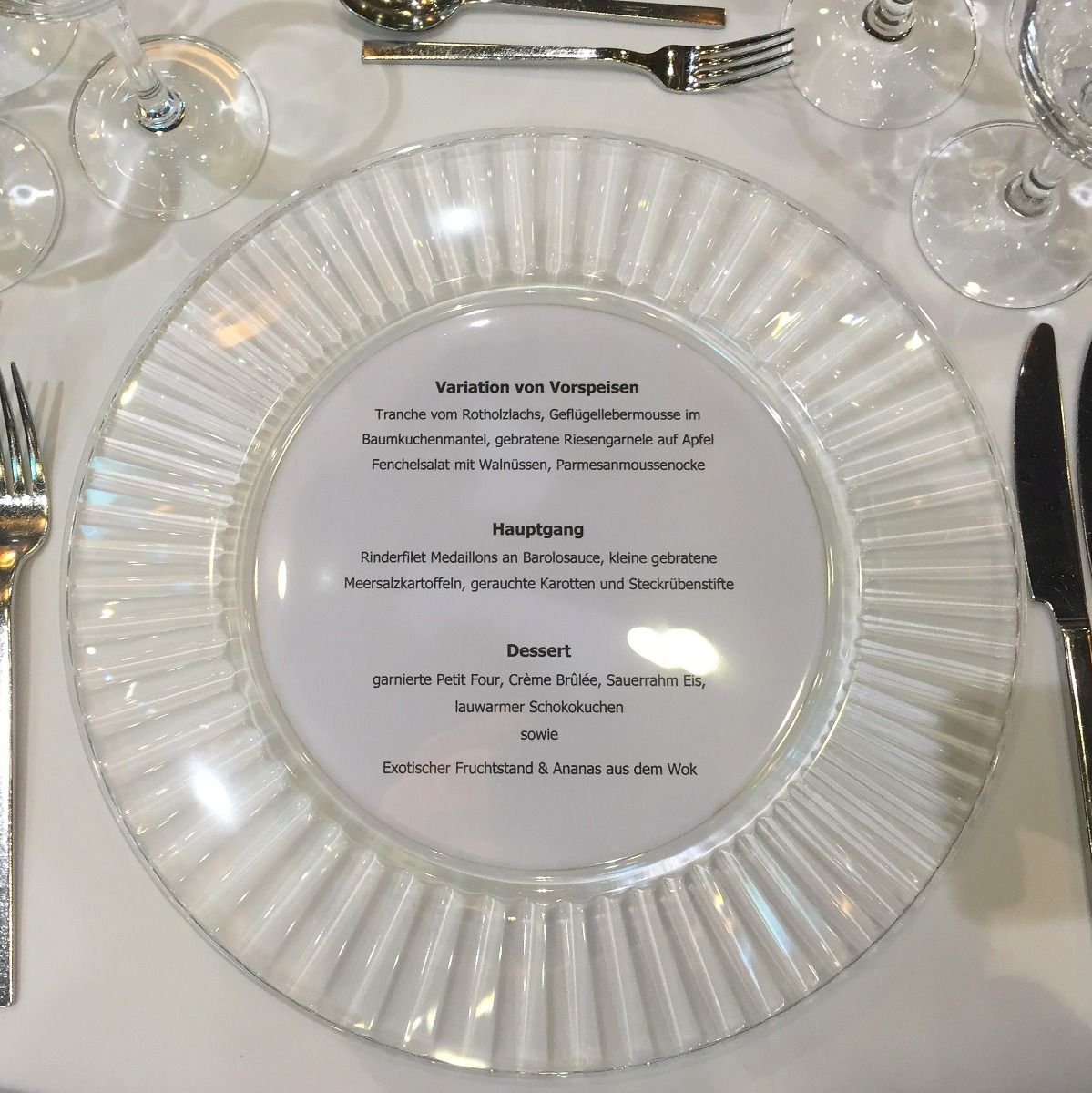 Das Highlight: unter diesen Teller kannst Du dein Menü oder andere wichtige Botschaften für deine Gäste platzieren. Bei der Gestaltung und Produktion helfen wir gern.