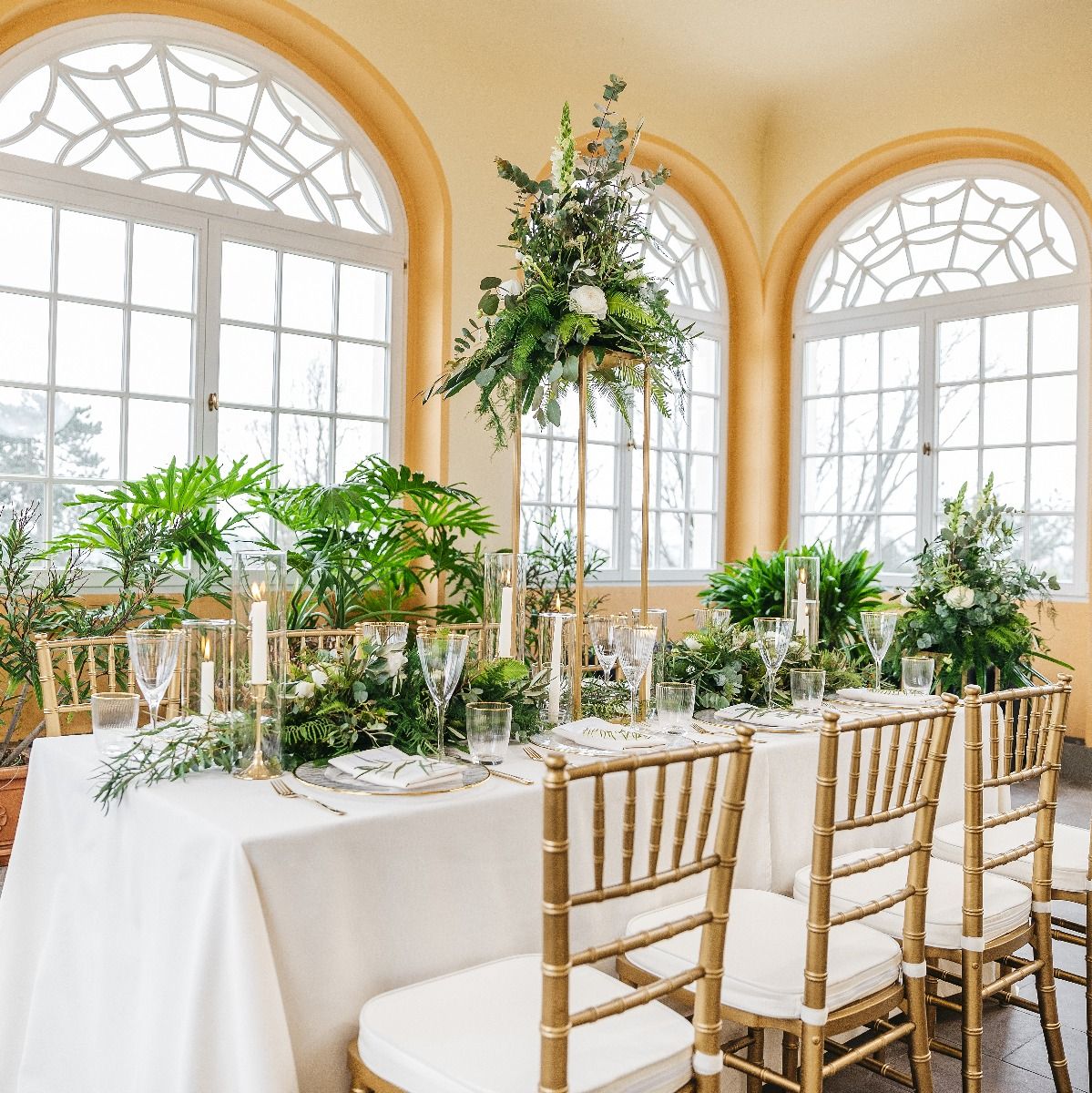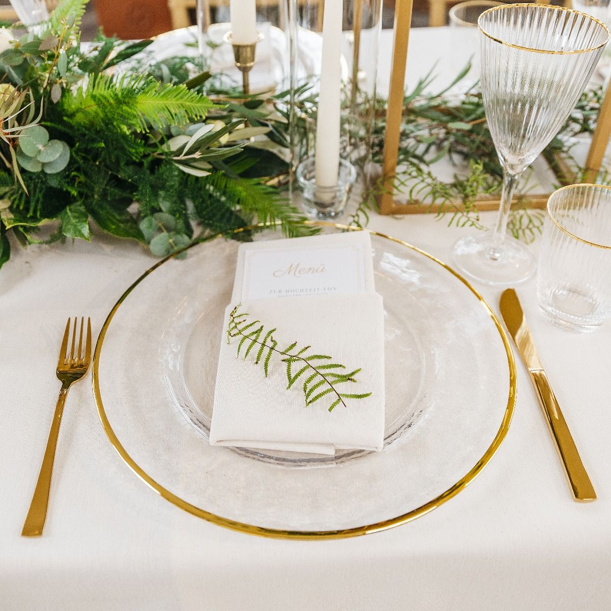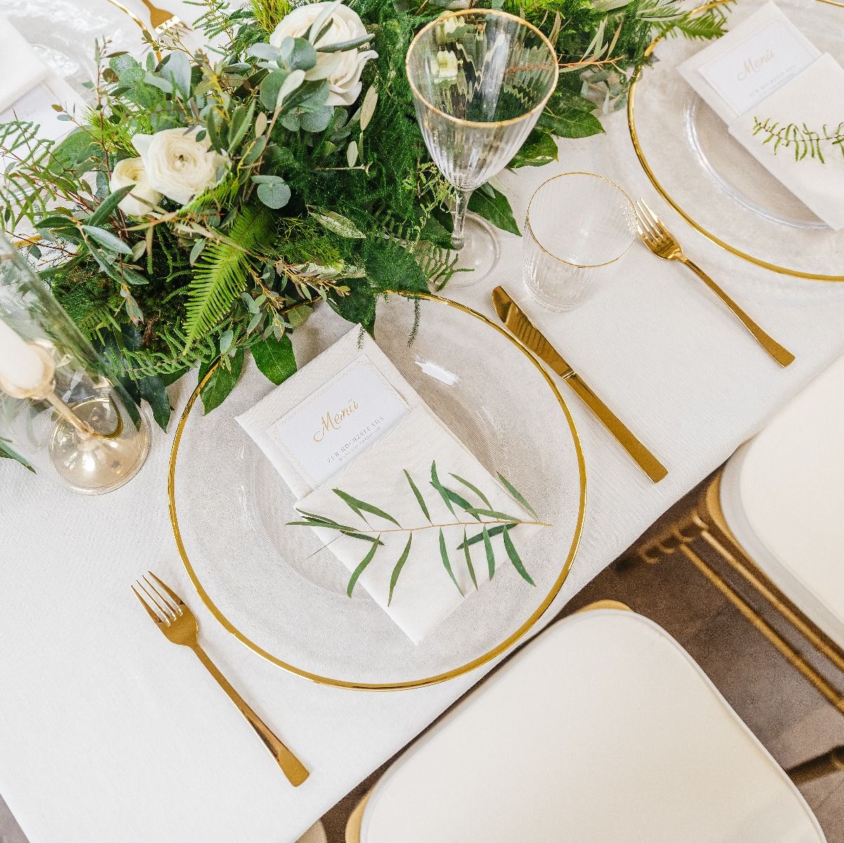 Englische Gärten leben von üppigem Grün und stilvoll inszenierter Natur. In Kombination mit weißen Blüten und etwas goldenem Bling entsteht so der Royal Garden auf deiner Tafel. Wundervoll für Hochzeit oder feines Dinner oder wenn Euch königlich zumute ist ...