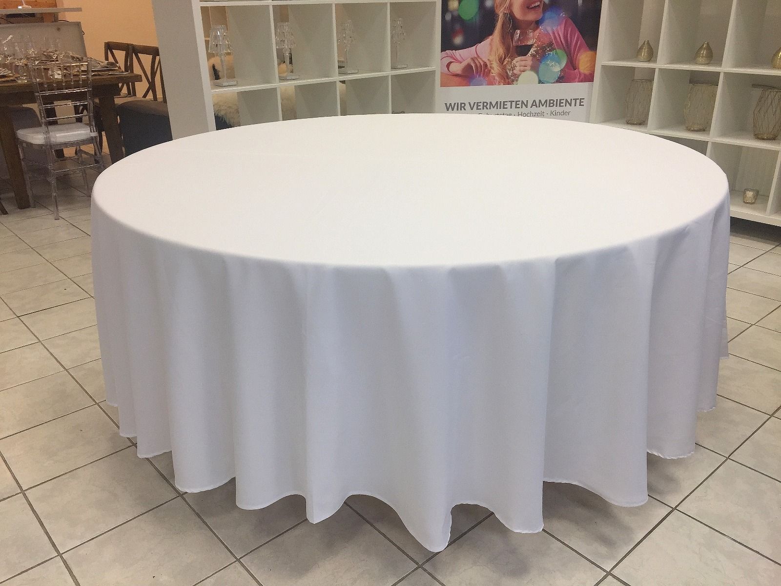 Ein elegantes rundes Tischtuch in strahlendem Weiß - passend für Banketttische D160-180 cm. Das Tischtuch hat einen tollen Faltenwurf und ist fast bodenlang. Somit ist es die ideale Tischdecke für Hochzeiten oder feine Dinner.
