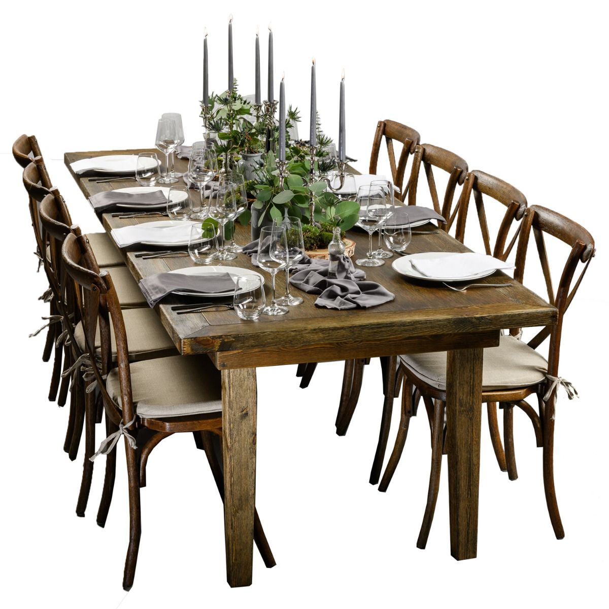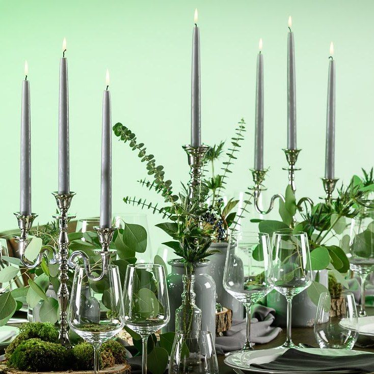 Man nehme einen Hauch Mystik, kombiniert mit sattem Purismus und ganz viel Natur – Voila, hier unser Tisch "Traumzauber". Grau und Grün verschmelzen zu romantischer Einheit, ohne dabei kitschig zu wirken. Leuchter, Besteck und feines Porzellan mit Silberrand bringen Glanz. Wunderschönes Blattwerk und blau-graue Disteln ersetzen den üblichen Blumenschmuck