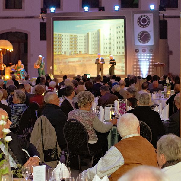 Die XXL Videowand steckt voller Überraschungen: Sie ist Bühnenbild, Videowand und Aftershow-Club zugleich. Die Displayfläche ist Rückprotauglich und später abziehbar. Dahinter ist Raum für einen Barbereich, den wir gern im 70er Stil dekorieren.