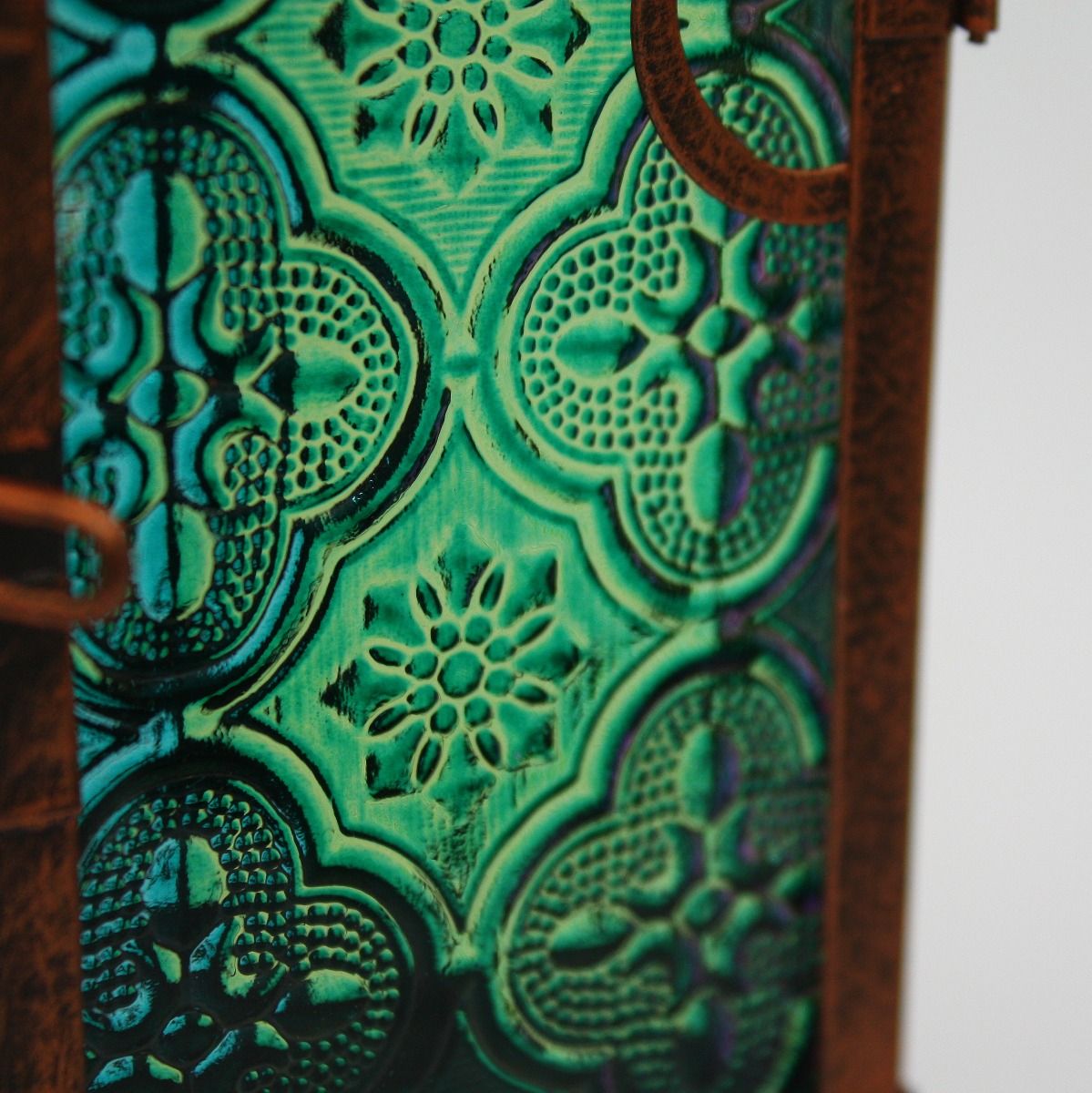 kunstvoll gearbeitetes Windlicht mit orientalischem Touch, Außenkörper aus Metall, innen mit Glaseinsatz für Kerzen oder LED-Lichterkette, ideal für exotische Designwelten, aber auch für Vintage- und Shabbychic zu Hochzeit oder Sommerparty